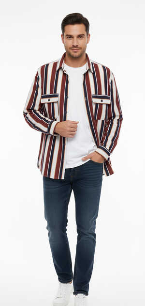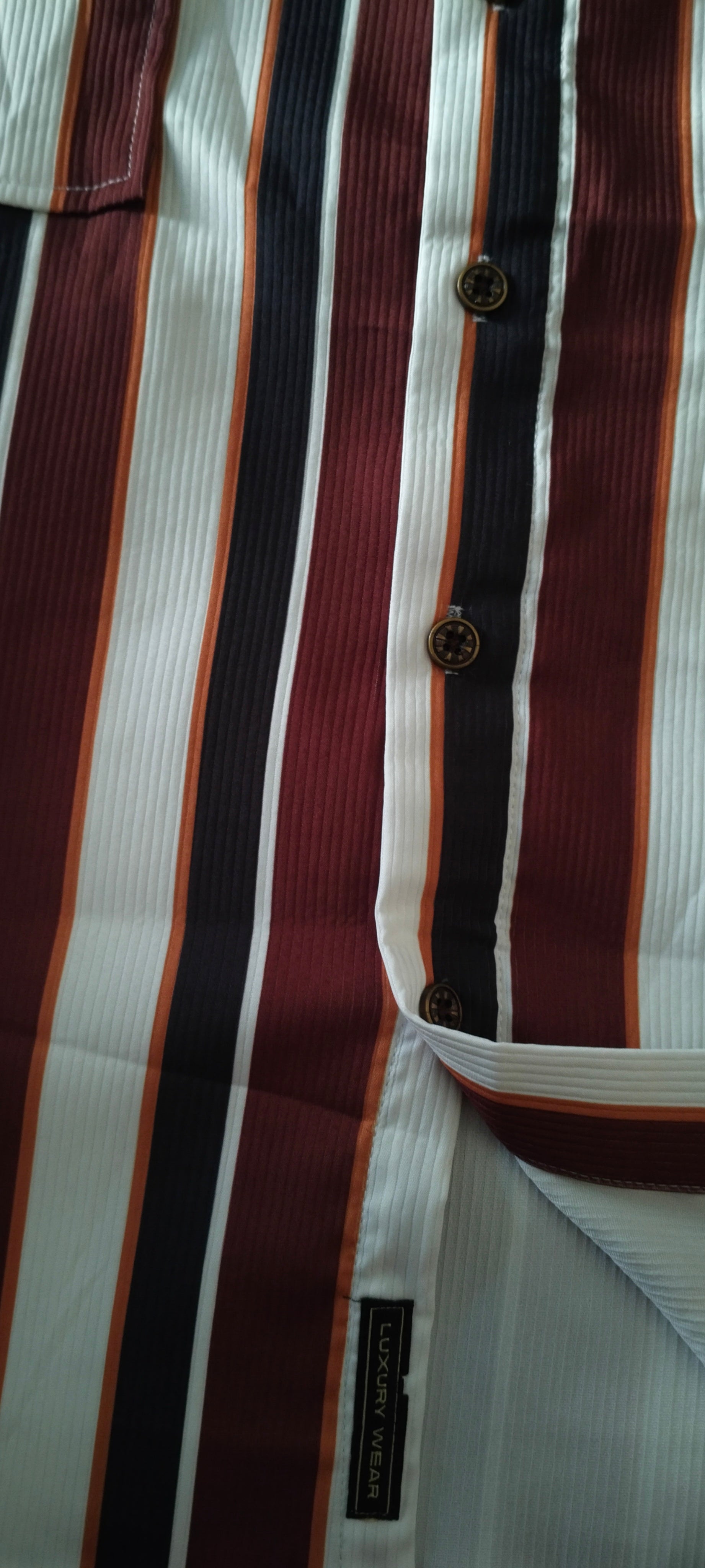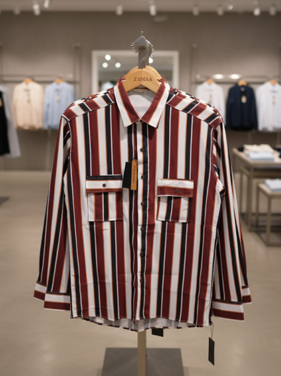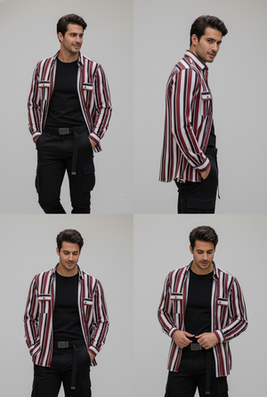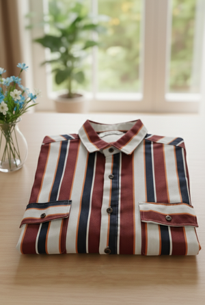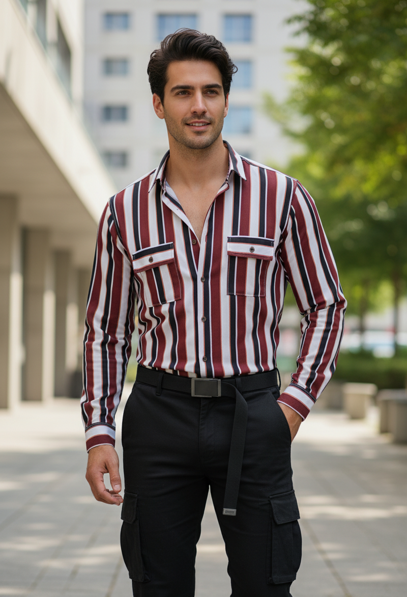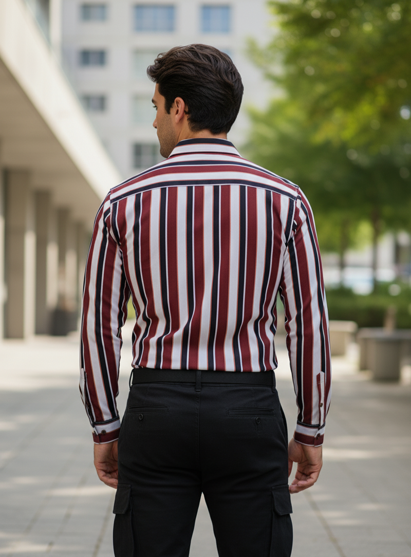 Discover refined style in motion with the Maroon Mirage Striped Shirt — a perfect balance of bold pattern and effortless sophistication. The vertical stripes in deep maroon, crisp white, and jet black create a sleek silhouette that elongates the frame and commands attention.