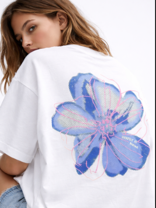 - Back: Large abstract floral graphic with modern detailing